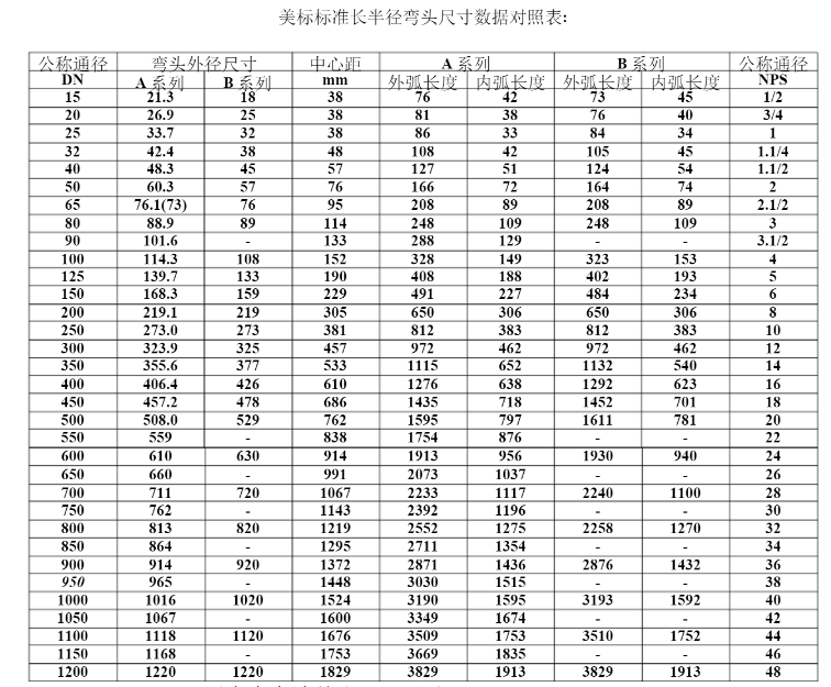 最新美标标准弯头尺寸表