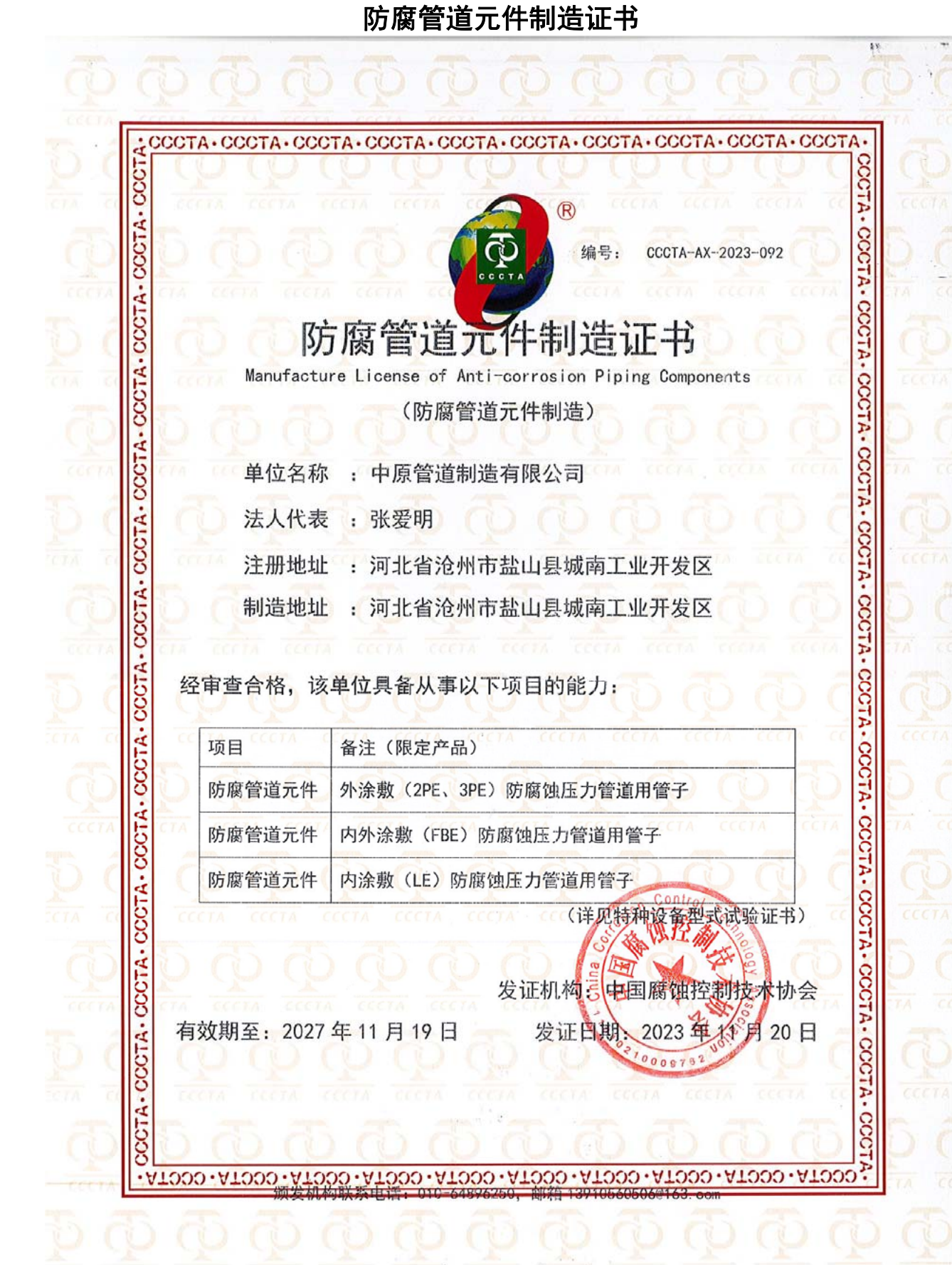 内外涂敷(FBE)防腐蚀压力管道用管子-防腐管道元件制造证书